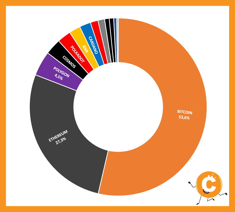 BITCOIN 53,6% - ETHEREUM 27,3% - POLYGON 4,5% - COSMOS 2,9% - POLKADOT 2,5% - CARDANO 2,1% - BNB 2,1% - AVALANCHE 1,4% - XRP 1,2% - ALGORAND 0,9% - NEAR PROTOCOL 0,8% - THE SANDBOX 0,5% - VULCAN FORGED PYR 0,3%