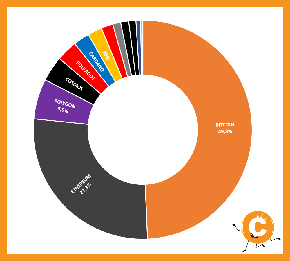 BITCOIN 49,3% - ETHEREUM 27,3% - POLYGON 5,9% - COSMOS 3,7% - POLKADOT 3,1% - CARDANO 2,3% - BNB 2,1% - AVALANCHE 1,7% - XRP 1,2% - ALGORAND 1,2% - NEAR PROTOCOL 1,1% - THE SANDBOX 0,7% - VULCAN FORGED PYR 0,3%