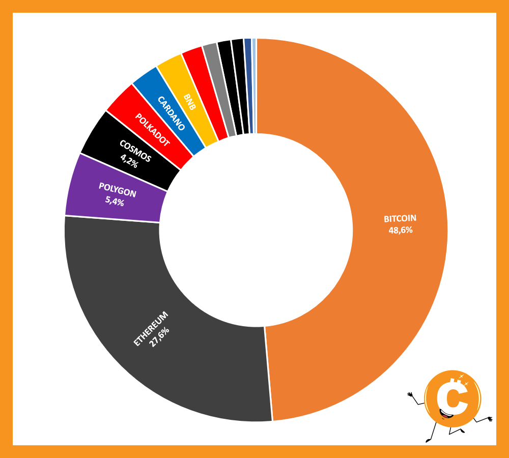 BITCOIN 48,6% - ETHEREUM 27,6% - POLYGON 5,4% - COSMOS 4,2% - POLKADOT 3,1% - CARDANO 2,5% - BNB 2,3% - AVALANCHE 1,8% - XRP 1,3% - ALGORAND 1,2% - NEAR PROTOCOL 1,1% - THE SANDBOX 0,7% - VULCAN FORGED PYR 0,4%