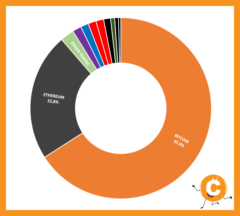 BITCOIN 65,9% - ETHEREUM 22,8% - POLYGON 1,6% - CARDANO 1,4% - AVALANCHE 1,4% - POLKADOT 1,4% - COSMOS 1,2% - PYTH NETWORK 0.7% - NEAR PROTOCOL 0,7% - ALGORAND 0,4% / DEGEN TOKENS 2,5%