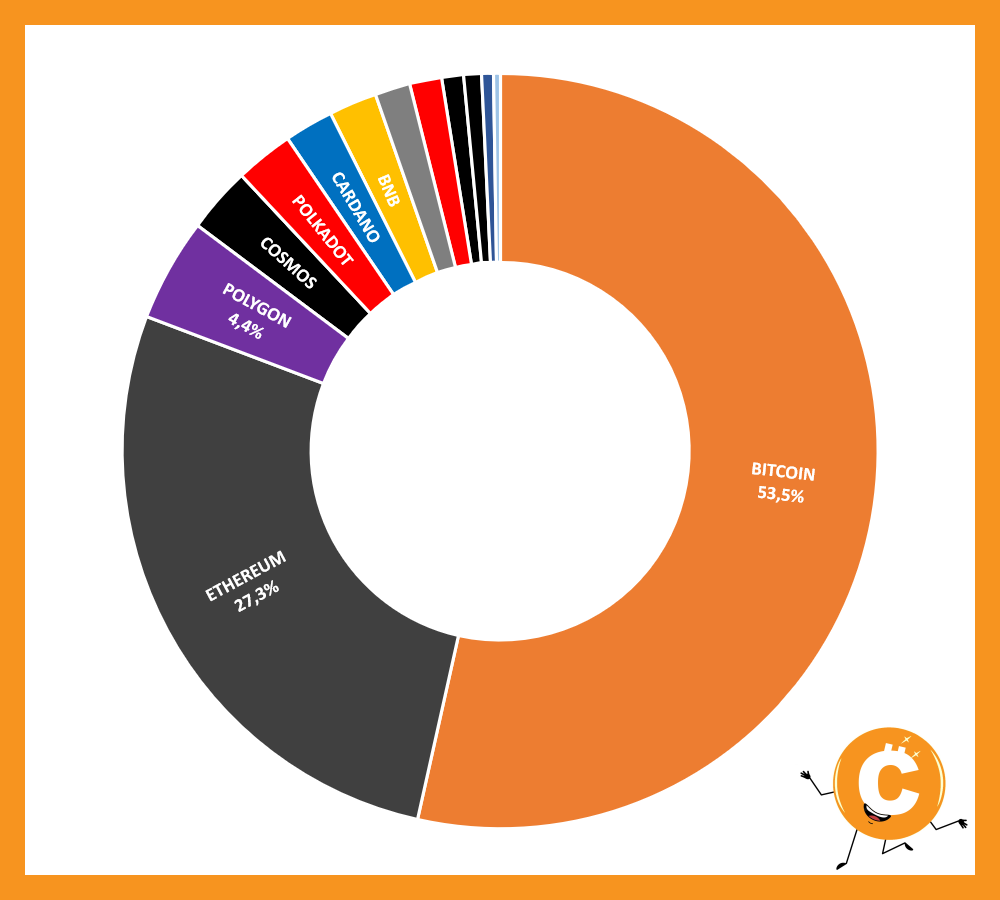 BITCOIN 53,5% - ETHEREUM 27,3% - POLYGON 4,4% - COSMOS 2,8% - POLKADOT 2,4% - CARDANO 2,1% - BNB 2,0% - XRP 1,5% - AVALANCHE 1,4% - ALGORAND 0,9% - NEAR PROTOCOL 0,8% - THE SANDBOX 0,5% - VULCAN FORGED PYR 0,3%