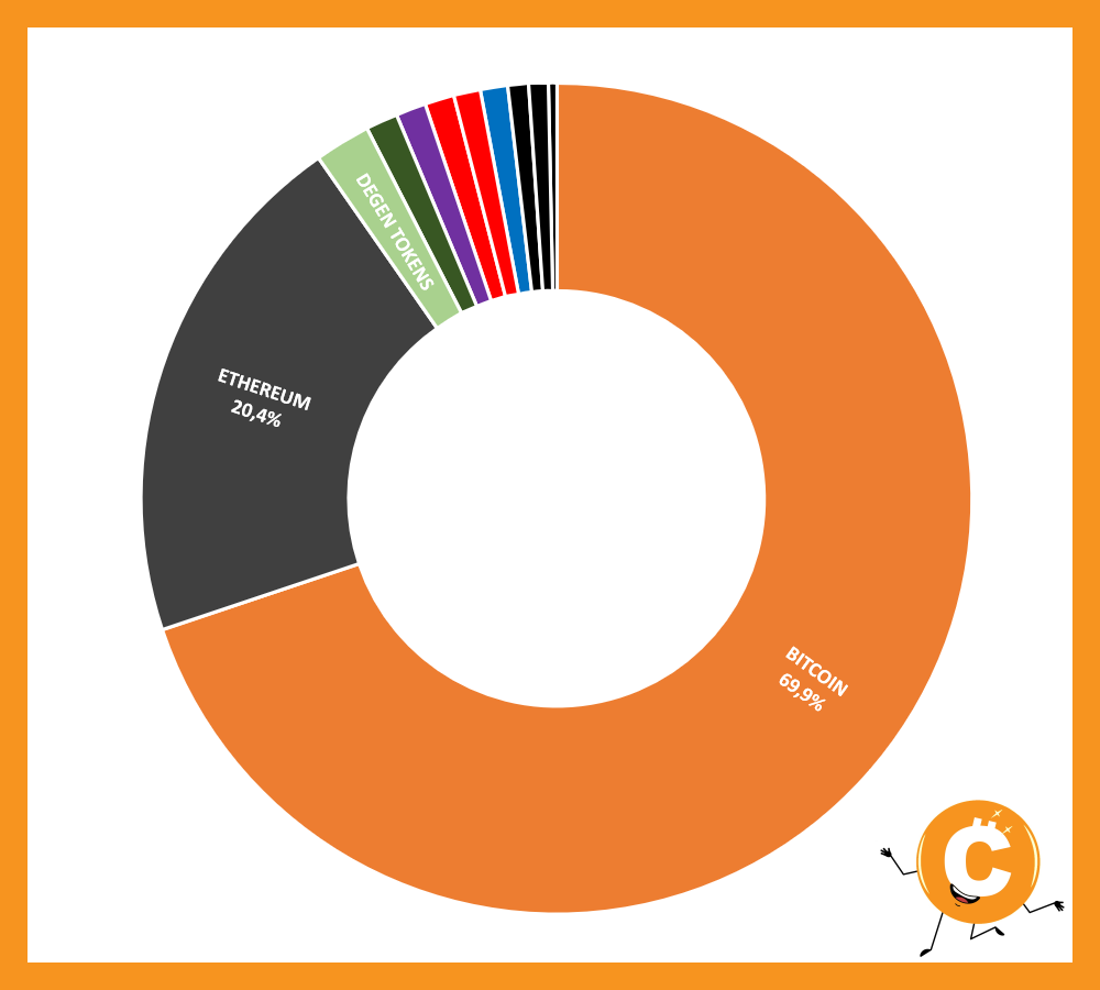 BITCOIN 69,9% - ETHEREUM 20,4% - POLYGON 1,2% - PYTH NETWORK 1,2% - AVALANCHE 1,1% - POLKADOT 1,1% - CARDANO 1,0% - COSMOS 0,8% - NEAR PROTOCOL 0,8% - ALGORAND 0,3% / DEGEN TOKENS 2,2%