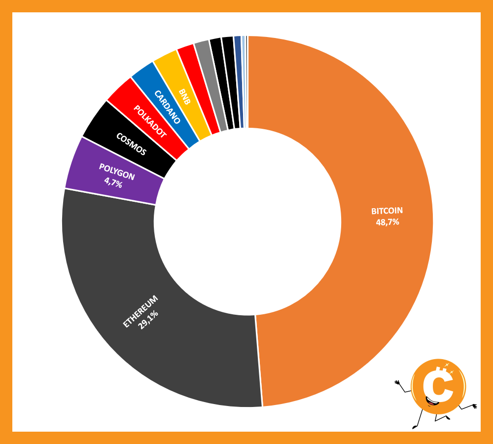 BITCOIN 48,7% - ETHEREUM 29,1% - POLYGON 4,7% - COSMOS 3,8% - BNB 2,3% - POLKADOT 2,9% - CARDANO 2,3% - AVALANCHE 1,6% - XRP 1,3% - ALGORAND 1,1% - NEAR PROTOCOL 1,0% - THE SANDBOX 0,7% - VULCAN FORGED PYR 0,3% - DYDX 0,2%