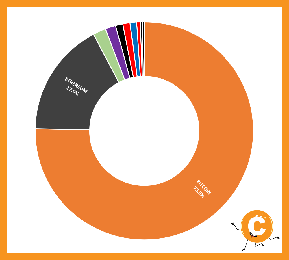 BITCOIN 75,3% - ETHEREUM 17,0% - POLYGON 1,6% - COSMOS 1,1% - POLKADOT 1,0% - CARDANO 1,0% - AVALANCHE 0,5% - ALGORAND 0,3% - NEAR PROTOCOL 0,3% / DEGEN TOKENS 1.9%