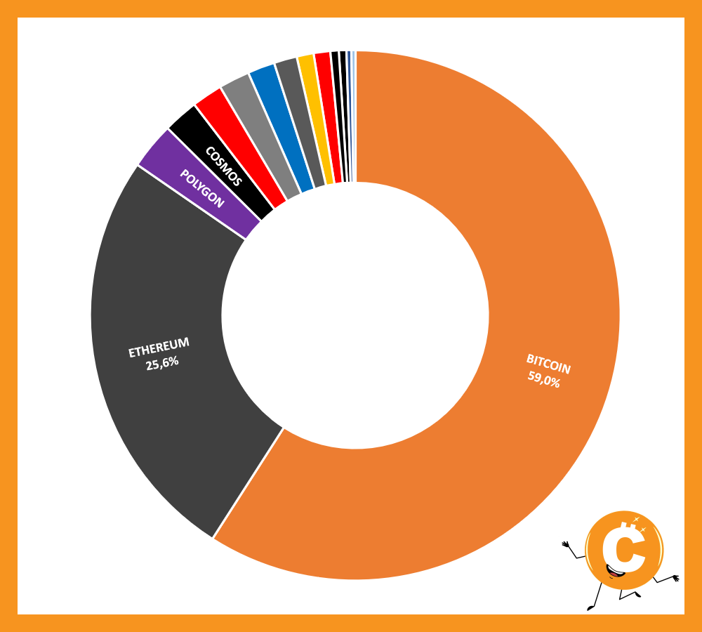 BITCOIN 59,0% - ETHEREUM 25,6% - POLYGON 2,9% - COSMOS 2,1% - POLKADOT 1,9% - CARDANO 1,7% - XRP 1,9% - BNB 1,0% - AVALANCHE 1,0% - NEAR PROTOCOL 0,5% - ALGORAND 0,4% - THE SANDBOX 0,3% - METIS 0.3% - AZERO 0.3% - VULCAN FORGED PYR 0,2% - ULTRA 0.2% - CHAINGE 0.2% - MORPHEUS 0.2% - FERRUM NETWORK 0,1% - MEDIA LICENSING 0.1%