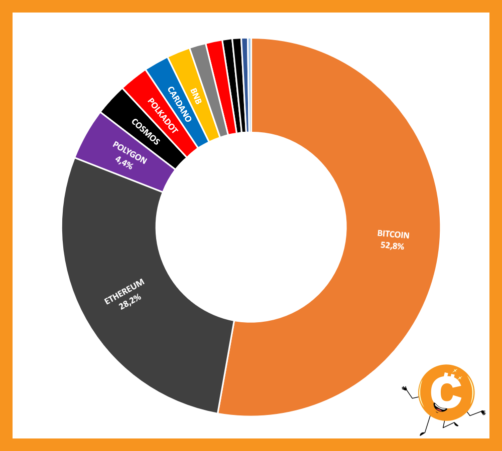 BITCOIN 52,8% - ETHEREUM 28,2% - POLYGON 4,4% - COSMOS 2,8% - POLKADOT 2,5% - CARDANO 2,1% - BNB 2,0% - AVALANCHE 1,4% - XRP 1,4% - ALGORAND 0,9% - NEAR PROTOCOL 0,8% - THE SANDBOX 0,5% - VULCAN FORGED PYR 0,3%