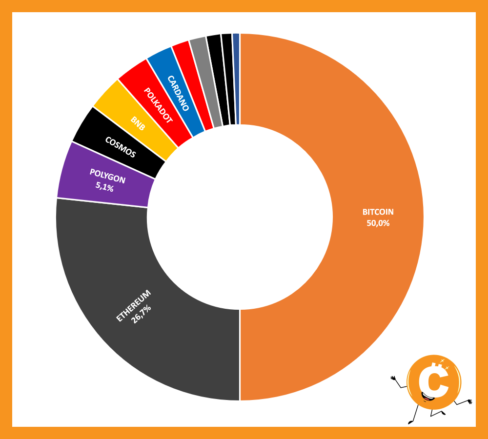 BITCOIN 50,0% - ETHEREUM 26,7% - POLYGON 5,1% - COSMOS 3,6% - BNB 3,2% - POLKADOT 3,0% - CARDANO 2,4% - AVALANCHE 1,6% - XRP 1,5% - ALGORAND 1,3% - NEAR PROTOCOL 1,0% - THE SANDBOX 0,7%