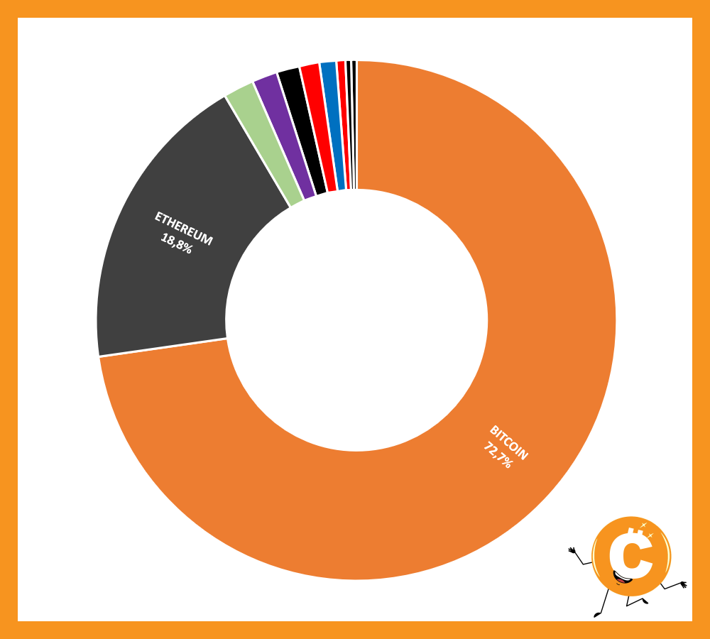 BITCOIN 72,7% - ETHEREUM 18,8% - POLYGON 1,6% - COSMOS 1,4% - POLKADOT 1,2% - CARDANO 1,1% - AVALANCHE 0,5% - ALGORAND 0,3% - NEAR PROTOCOL 0,3% / DEGEN TOKENS 1.9%
