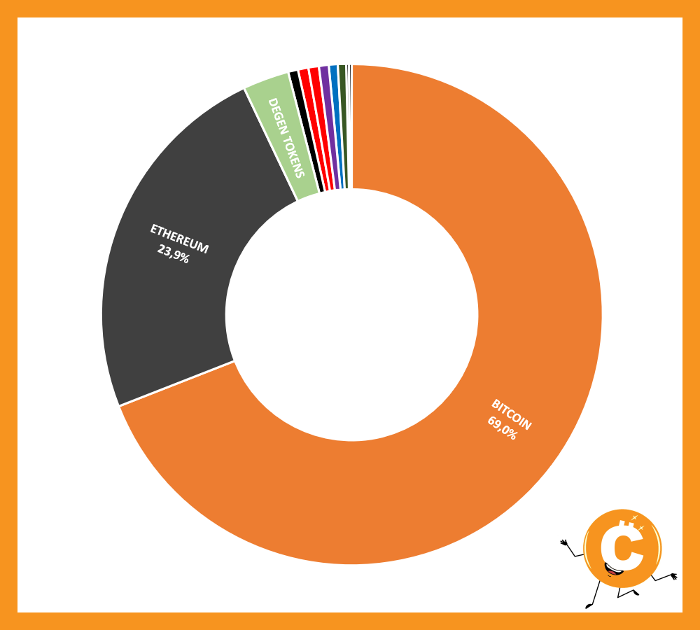 BITCOIN 69,0% - ETHEREUM 23,9% - NEAR PROTOCOL 0,7% - AVALANCHE 0,7% - POLKADOT 0,7% - POLYGON 0,7% - CARDANO 0,6% - PYTH NETWORK 0,5% - COSMOS 0,2% - ALGORAND 0,2% / DEGEN TOKENS 2,9%