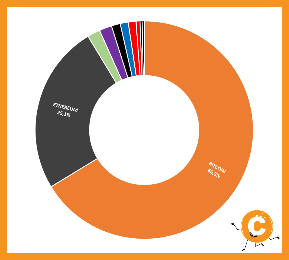 BITCOIN 66,3% - ETHEREUM 25,1% - POLYGON 1,9% - COSMOS 1,3% - CARDANO 1,2% - POLKADOT 1,1% - AVALANCHE 0,6% - NEAR PROTOCOL 0,3% - ALGORAND 0,3% / DEGEN TOKENS 1.9%
