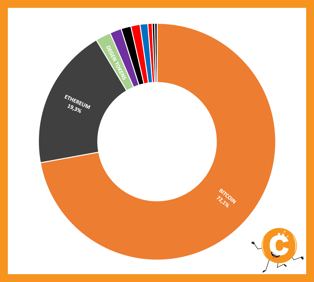 BITCOIN 72,1% - ETHEREUM 19,3% - POLYGON 1,6% - COSMOS 1,4% - POLKADOT 1,2% - CARDANO 1,1% - AVALANCHE 0,6% - ALGORAND 0,3% - NEAR PROTOCOL 0,3% / DEGEN TOKENS 2.1%