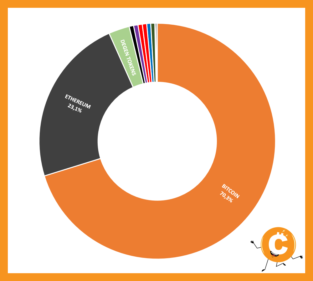 BITCOIN 70,3% - ETHEREUM 23,1% - NEAR PROTOCOL 0,6% - AVALANCHE 0,6% - POLYGON 0,6% - POLKADOT 0,6% - CARDANO 0,6% - PYTH NETWORK 0,5% - COSMOS 0,2% - ALGORAND 0,2% / DEGEN TOKENS 2,9%