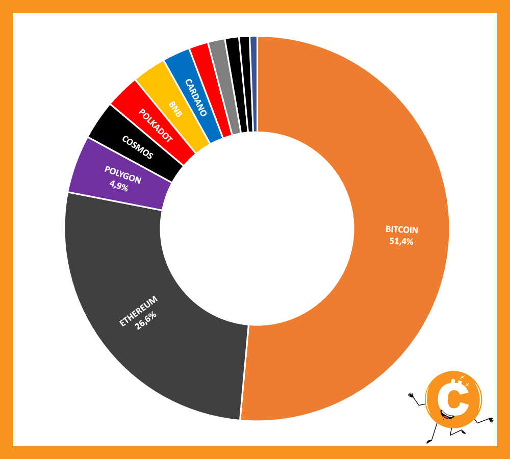 BITCOIN 51,4% - ETHEREUM 26,6% - POLYGON 4,9% - COSMOS 3,3% - BNB 2,9% - POLKADOT 2,9% - CARDANO 2,3% - AVALANCHE 1,6% - XRP 1,5% - ALGORAND 1,2% - NEAR PROTOCOL 0,9% - THE SANDBOX 0,6%