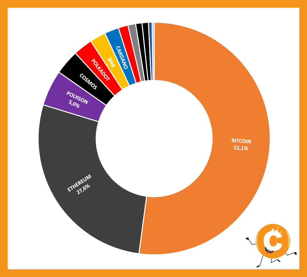 BITCOIN 52,1% - ETHEREUM 27,6% - POLYGON 5,0% - COSMOS 3,5% - POLKADOT 2,6% - CARDANO 2,0% - BNB 2,2% - AVALANCHE 1,4% - XRP 1,1% - ALGORAND 0,9% - NEAR PROTOCOL 0,8% - THE SANDBOX 0,5% - VULCAN FORGED PYR 0,3%
