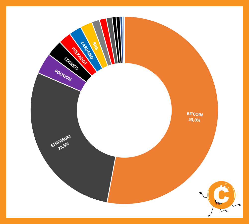 BITCOIN 53,0% - ETHEREUM 28,5% - POLYGON 3,6% - COSMOS 2,8% - POLKADOT 2,2% - CARDANO 2,2% - BNB 2,1% - XRP 1,3% - AVALANCHE 1,2% - ALGORAND 0,7% - NEAR PROTOCOL 0,7% - THE SANDBOX 0,4% - VULCAN FORGED PYR 0,3% - ULTRA 0.2% - CHAINGE 0.2% - MORPHEUS 0.2% - FERRUM NETWORK 0,2% - MEDIA LICENSING 0.2%